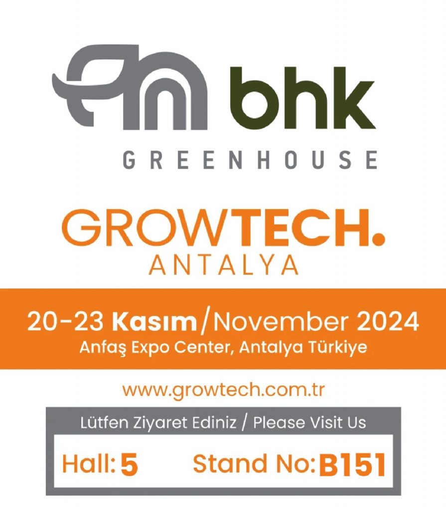 As BHK Greenhouse, we would be happy to welcome you, our valued visitors, at Hall:5 and Stand:151 at the Growtech Antalya Fair, which will take place between 20-23 November 2024. The related Agricultural Technologies and Greenhouse Fair will take place at the Anfaş Expo Center in Antalya/Turkey. You can contact BHK Greenhouse customer service for an invitation.